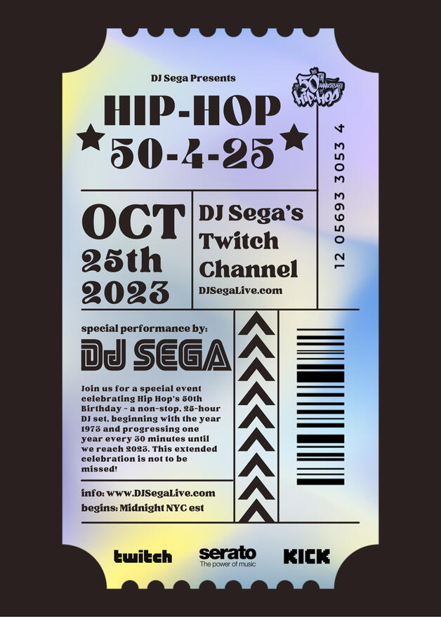 From the heart of the golden jubilee of Hip-Hop's inception, there is no better way to celebrate it than with an electrifying, non-stop, 25-hour DJ set by none other than the incredible DJ Sega. Known for his energetic performances and captivating track mixes, DJ Sega is set to take us on a thrilling musical journey through the history of Hip-Hop, starting from its inception in 1973 all the way to the present year 2023.Experience A Musical Journey Through Five Decades of Hip-Hop